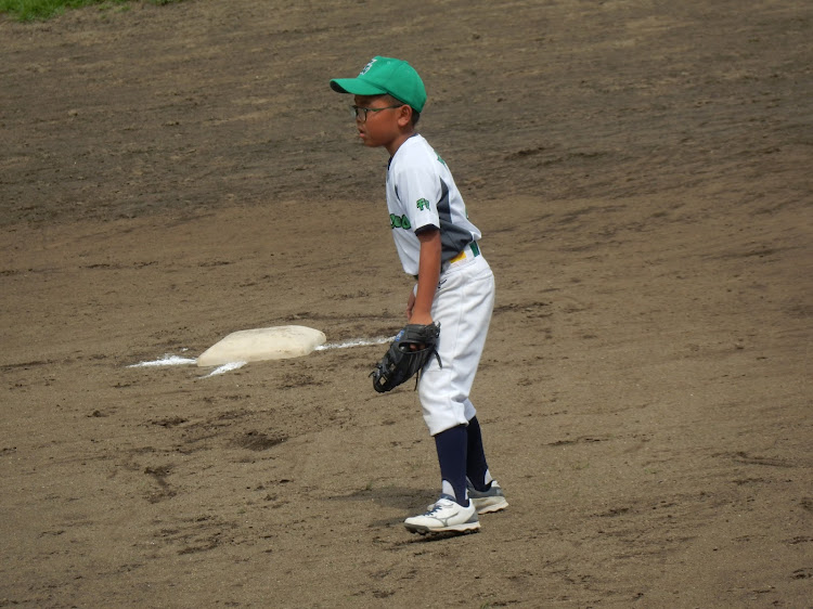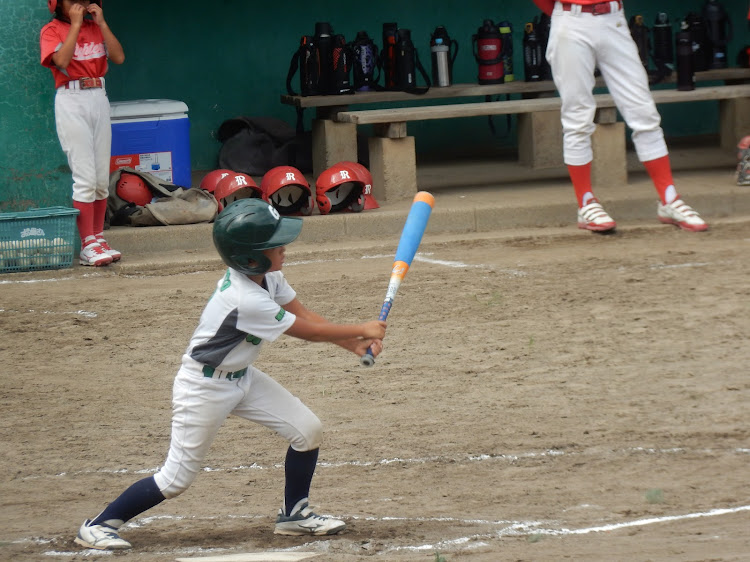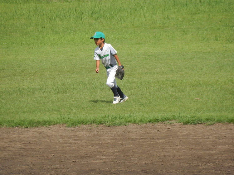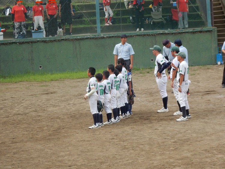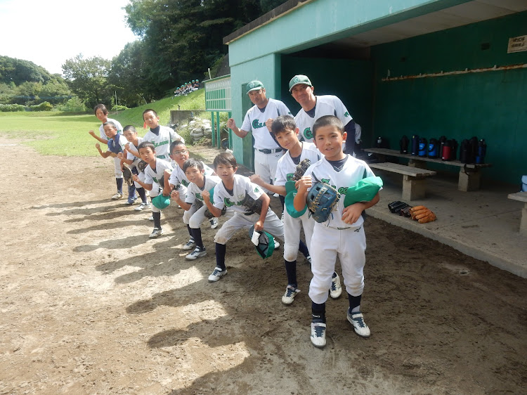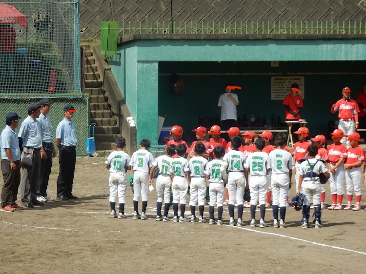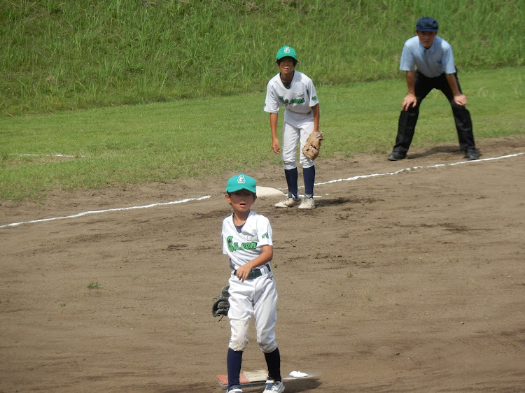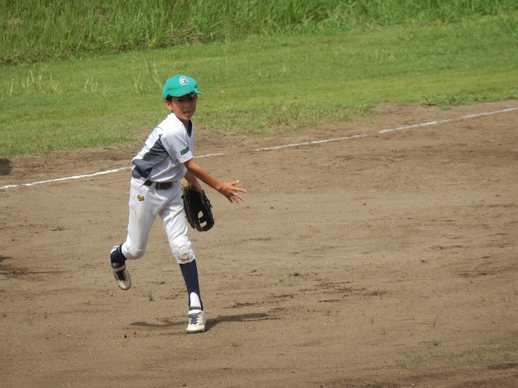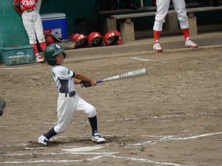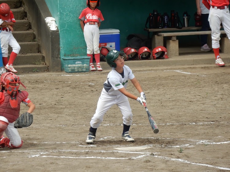 スポ少秋季大会第2戦vs北柏レッドスターズ 今大会は負傷欠場のソウマに代わってエナが入り優勝を狙うCチーム。先発のタイガは、初回内野ゴロの間に1点を先取され、なお2,3塁のピンチだったが、慌てず後続を断っていいスタートだ。1回ウラ アキトのタイムリー2塁打、アオヒの内野安打で2点を入れ逆転した。2回はタイガ制球が乱れ3四死球で満塁となったが、ヒットを打たせず内野ゴロで3点にとどめたのが大きかった。そして5:3と2点差で迎えた最終回、2死と追い込まれたがここからが凄かった。エナがレフトオーバーの2塁打でグリーンズが一気に盛り上がった!タイガがライトオーバーの2塁打で続く、カイトも気迫で2塁への内野安打で同点、ニナトもレフトへ逆転打を放った!その後は2四球をはさんでコウヘイはレフト前、アオヒ3塁打、エナ・タイガ・ヒロトがヒットで続いた。2死からの10点、大逆転劇で強さを見せてくれたグリーンズCチームだった。